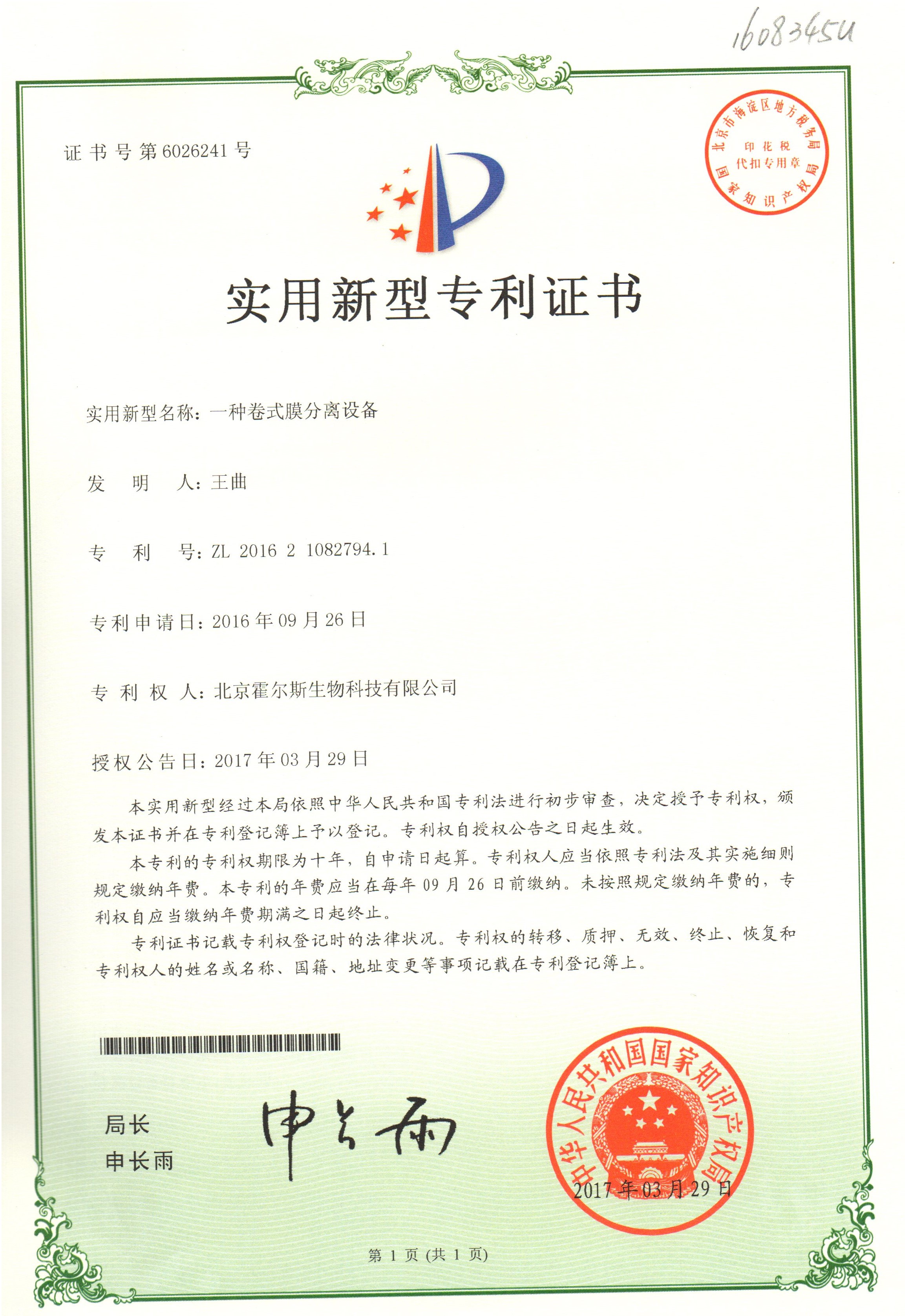 Holves obtain the patent of membrane separation equipment.