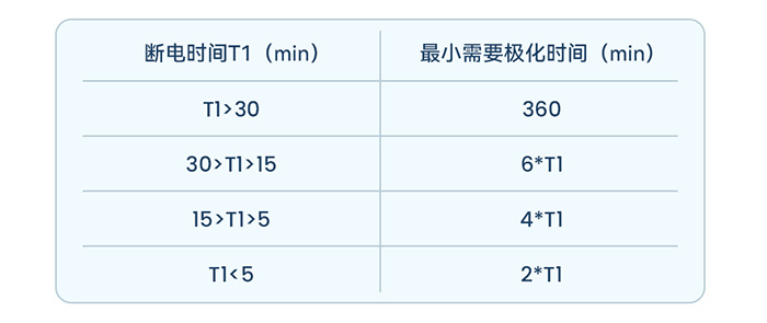 ③ 變送器斷電或電極與電纜線斷開,最小極化時(shí)間見下表。