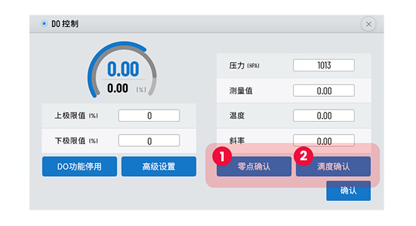 將電極接通電源后,先放入無氧環(huán)境中,待讀數(shù)穩(wěn)定后點(diǎn)擊“零點(diǎn)確認(rèn)”,再將電極放入純氧環(huán)境中,待讀數(shù)穩(wěn)定后點(diǎn)擊“滿度確認(rèn)”,彈出窗口“DO電極OK”即表示校準(zhǔn)完成。