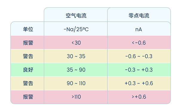 以空氣為校準(zhǔn)介質(zhì)進(jìn)行校準(zhǔn)后,參考極譜式溶氧電極電流信號(hào)表中空氣電流的標(biāo)準(zhǔn),判斷DO電極的斜率是否正常。
